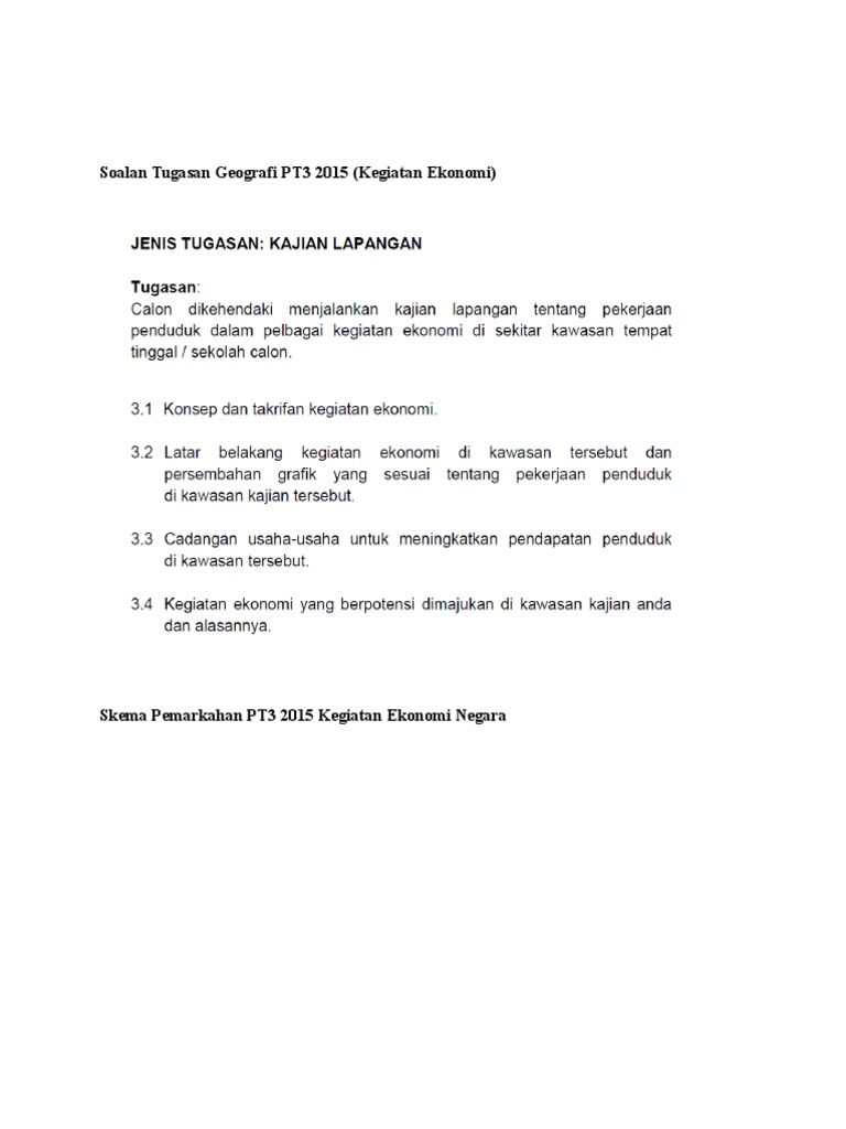 TUGASAN GEOGRAFI PT3 2015 Calon dikehendaki menjalankan kajian lapangan tentang pekerjaan penduduk dalam pelbagai kegiatan ekonomi disekitar kawasan tempat. Soalan Sebenar SPM dan Skema Jawapan. Contoh Rumusan Tugasan Kerja Kursus Geografi PT3Pentaksiran Tingkatan 3.